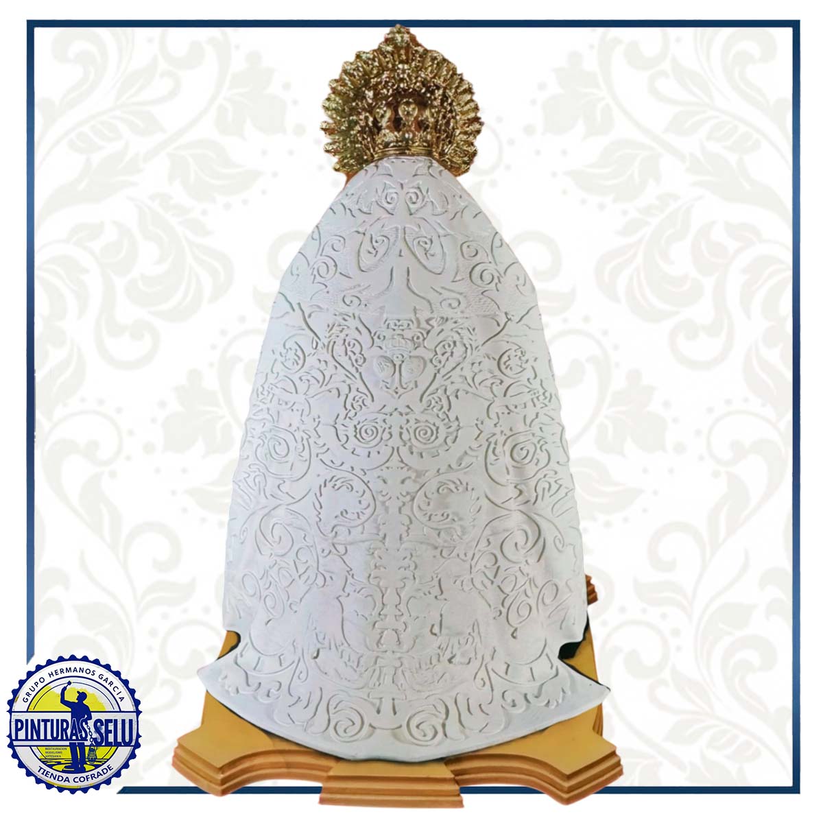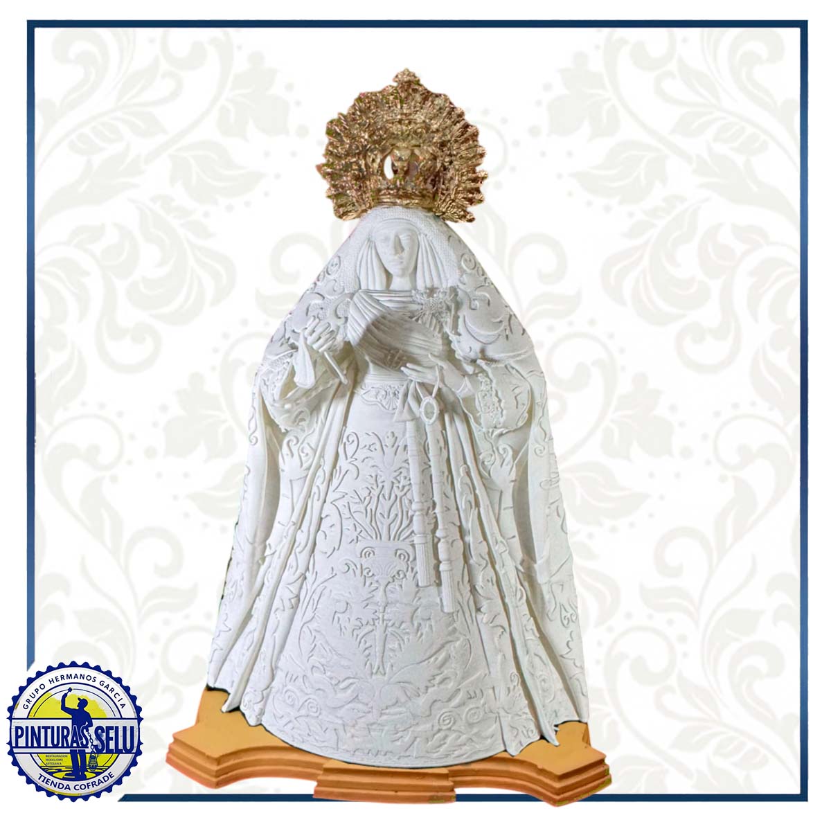 Gracias a la impresión 3D, se consigue una definición extraordinaria en los pliegues de las vestiduras, la corona, la mirada y los detalles florales. Esta figura es un homenaje a la devoción trianera, uniendo las nuevas tecnologías con el respeto a la tradición.